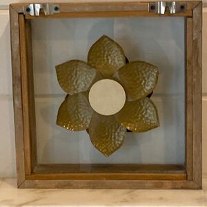 Wood and glass shadowbox frame with a metallic gold flower inside. 10” Square x 2” Deep. The flower measures 6.5” x 5.5”. Ready for hanging with 2 hooks on the back. Excellent Used Condition with no Flaws! Smoke & Pet Free Home. Shipping Same Day or Next! Bundle & Save!