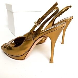 Bold Metallic Gold Gianvito Rossi Peep-toe Slingback heels 38. Very light wear, there are a few markings on the heels, as highlighted, and a little bit of wear to the tops, again as shown. Beautiful, comfortable heels, the peep toe is simply too large for my narrow foot. Barely worn. Please review photos, these are amazing heels at an amazing price. Stunning bronze/dark gold metallic patent leather. TTS for Gianvito Rossi’s sizing. Authentic, no box will however ship well protected. 3.75” heel.