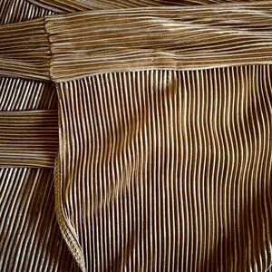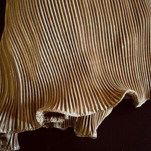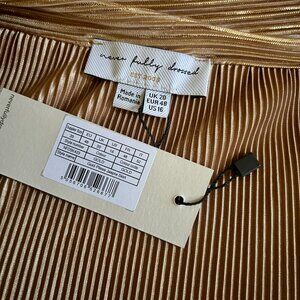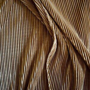 Fabulous, comfortable pleated "plissé" wrap skirt. Bright gold is hard to capture in the photos. The original listing is a little too bright, and my pics are too brown. New with tags. Australian brand Never Fully Dressed. Lightweight and shimmers when you move. Packable. Great for holidays, cruises, and weddings, other WOW occasions. The wrap overlaps. The original listing shows the model popping her leg — that's not how this drapes. Summer or winter-friendly. Size 16 but the wrap style is adjustable for different sizes.