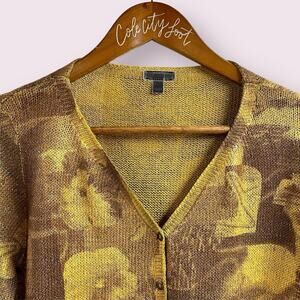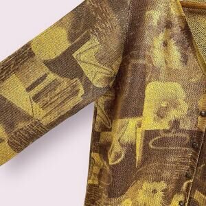 Metallic Gold Print Snap Front V Neck Cardigan Sweater Small Fitted