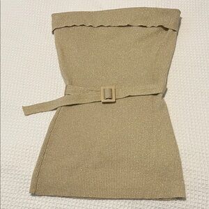 This elegant metallic gold strapless top is perfect for any occasion. The stylish belt accentuates your waist, offering a flattering silhouette. Ideal for both casual and formal events. Can layer under blazers and cardis as well.