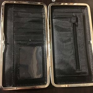 Hard top metallic print wallet clutch with interior card slots. Snaps shut. Never been used.