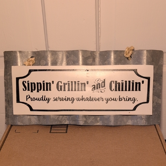 Metallic sign with 'Sippin' Grillin' and Chillin'' text. Perfect for outdoor decor.