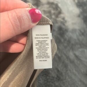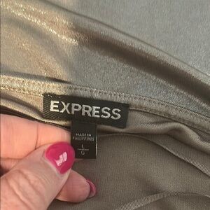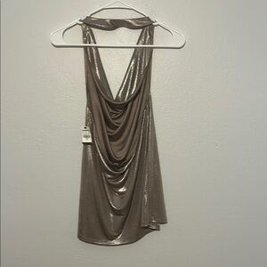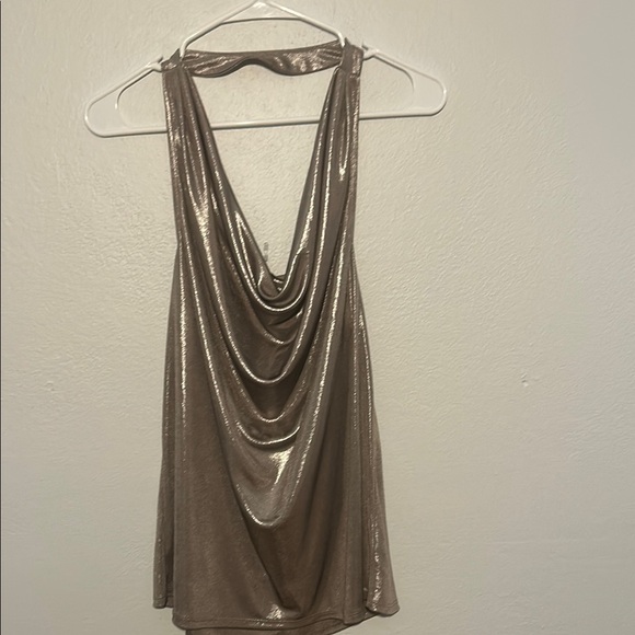 Shimmering metallic halter top with a draped neckline. Perfect for a night out.