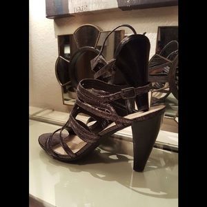 Love love these shoes. Worn once because straps are difficult for me to wear I have found. Dark bronze color, fancy heel.