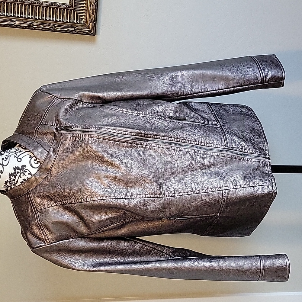 Alfani metallic jacket to add class to a night out. Non-leather with polyester lining.