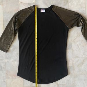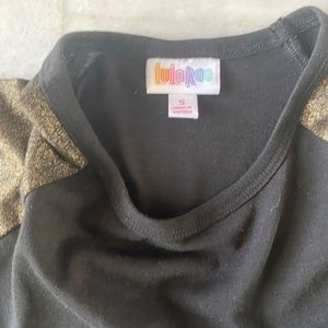 NWOT LuLaRoe randy from the elegant collection. Soft black body front/back with gold metallic 3/4 sleeves. Great casual top that can be dressed up or down. Removed tags, washed once & never worn. No tears, snags, stains or defects. Poly/spandex blend. Soft stretchy knit. Great shirt!