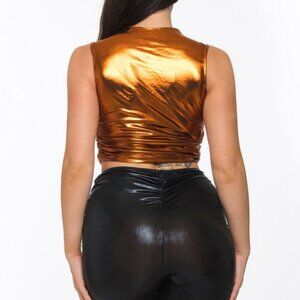 Make a bold statement with this metallic mock neck crop top, designed to turn heads from day to night. The sleek sleeveless silhouette pairs a high neckline with a cropped hem for a flattering, modern look. Crafted from a blend of polyester and spandex, it offers a smooth, body-hugging fit with just the right amount of stretch. Its eye-catching metallic finish adds instant edge and shine, making it a standout piece for parties, nights out, or elevated everyday wear. Whether styled with high-waisted jeans or a tailored skirt, this top delivers shine and style in equal measure.