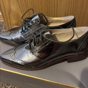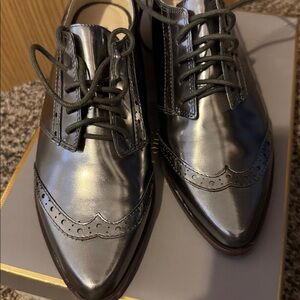Stylish metallic oxford brogues with lace-up design. Perfect for a chic look. Gun metal color.