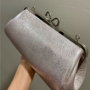 One of a kind. This cute and stylish bag is handmade from genuine leather, metallic pearl pink color with unique bowknot shaped kiss lock closure. Spacious enough for your phone, sunglasses, cosmetics, compact umbrella, keys & other items that you may need. Use in multiple ways, can be a clutch, wristlet, crossbody, and shoulder bag. Accessorize as a day or evening bag, or a gift for an important someone.