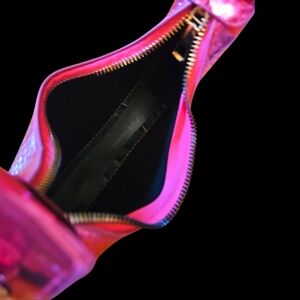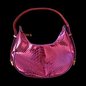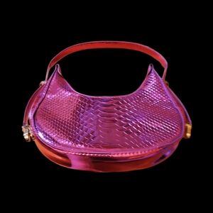 Metallic pink shoulder bag featuring a faux striking snakeskin pattern. Add a pop of color to your outfit with this elegant accessory.