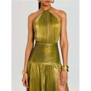 Metallic Pleated Maxi Gown -Glitter Green Halter Neck Slit Maxi
