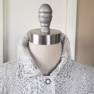 Design/Details: Chic metallic printed denim utility jacket. Design features an elevated details and a stylish edge. Crafted from premium denim and polished sheen finish.