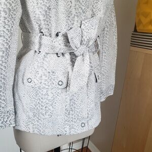 Jacket provides allover sheen, functional patch pockets, collar, long sleeves, and removable belt.