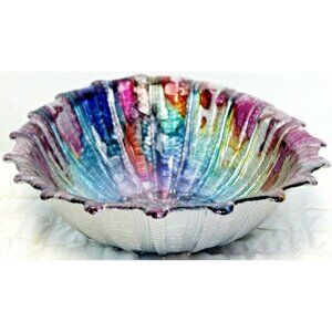 Metallic Rainbow Art Glass Bowl Serving Display Scalloped Shell Oval Texture