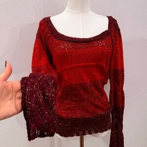 metallic sweater, red shimmer knit, ombre sweater, holiday party top, square neck sweater, y2k fashion, glam aesthetic, vintage knitwear, romantic winter outfit, 2000s inspired look, sparkly top, metallic red top, festive chic style