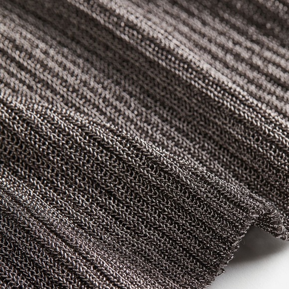 Fitted, rib-knit sweater with shimmery , metallic threads. Round neckline, short sleeves, and a straight hem. Grey/silver-colored.