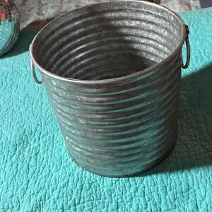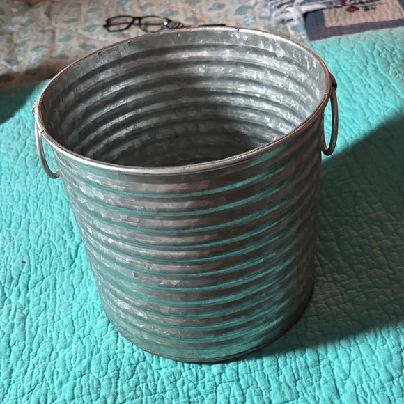 Stylish metallic ribbed bucket with handles. Perfect for storage or decor. 8 inches tall. 27 inches circumference
