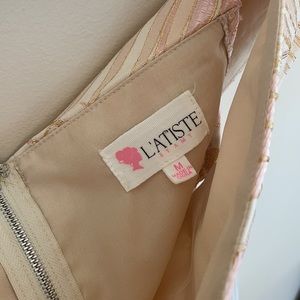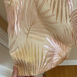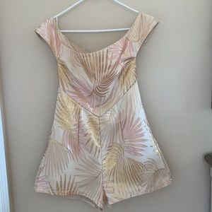Super pretty metallic rose gold and gold romper with a subtle leaf print. In a size medium but fits small/medium. Size 2-6. Open back detail with a cutout. Invisible zipper up the back. Can be worn on or off the shoulder.