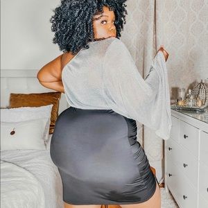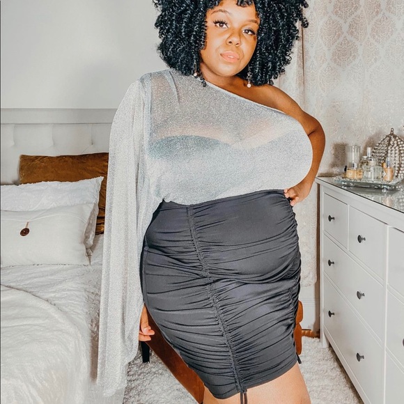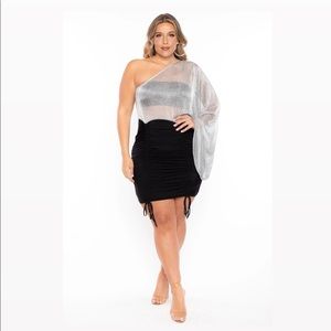 This plus size, stretch knit dress features an asymmetric neckline, one long sleeve the top is a metallic fishnet, front ruched detail, and a bodycon skirt