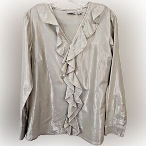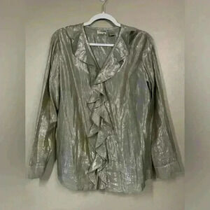 Metallic Ruffle Liquid Knit Button Blouse Gray Gold L/S Shiny Glam Party Top L