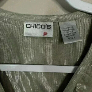 Tagged Chico’s size 2 (fits like L or US 12–14). Made in China. Fabric is 72% Cotton, 17% Metallic, and 11% silk. Flat measurements: bust 21.5 inches, length 26 inches, sleeve length 23.5 inches. Excellent gently pre-owned condition with no stains, snags, or visible wear.