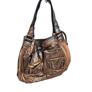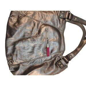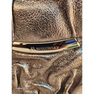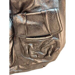 This B. Makowsky tote bag boasts a metallic silver finish and a stylish leopard print lining. Crafted from genuine leather, it features buckle accents and offers ample space for essentials, making it a versatile accessory for both casual and professional settings.