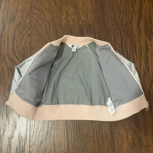 This bomber jacket makes a statement. Silver metallic color with pink accents. Zips up with rose gold zipper. Pockets are for show and are not functional.