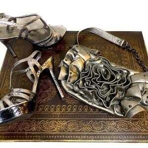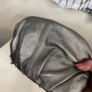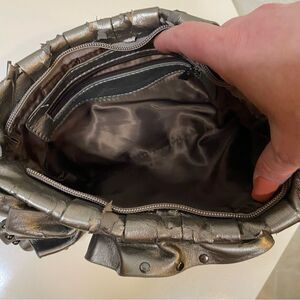 Stylish metallic silver handbag with ruffled design and stud accents. Center ruffled floral accent. Reminds me of a Valentino bag. Perfect for a chic look.