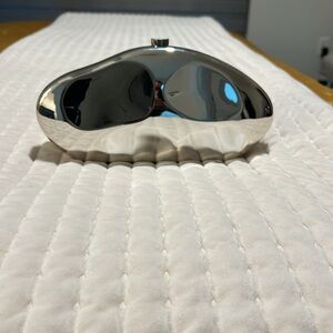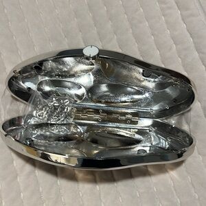 Oval shaped metallic clutch, 10x5”, shoulder strap.