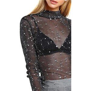 Metallic Star Embroidered Mesh Sheer Mock Neck Long Sleeve Tops Tee T-Shirt