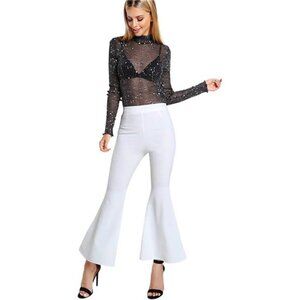Metallic Silver Star Embroidery Mesh Sheer Transparent Mock Neck Long Sleeve Tops Tee T-Shirt