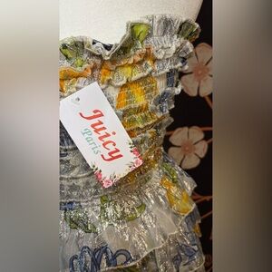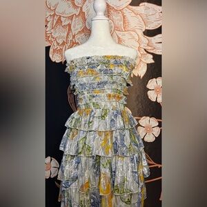 Adorable strapless smocked bodice mini dress with multi-tiered ruffle skirt. This dress shines bright with metallic silver sheen and floral and lemon print accent. Perfect for social events, concerts, or a night out!