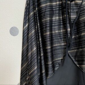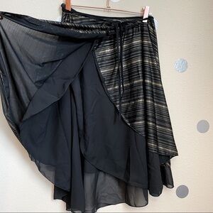 Black wrap double-layered asymmetric overskirt with gold metallic stripes on the shell layer and longer sheer black fabric on the lining layer. Great for practicing dance or for going out. When completely unwrapped, the width is 43”. The skirt’s length is 25.5”. New without tags.