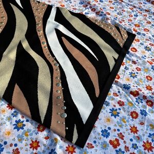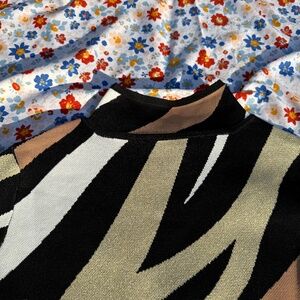The Metallic Studded Zebra Bell Sleeve Sweater Dress takes knitwear to the next level with a bold zebra pattern and statement gold studs. The stretchy, weighted fabric feels as good as it looks, offering a body skimming silhouette that is both comfortable and flattering. Ideal for when you want comfort with a kick.