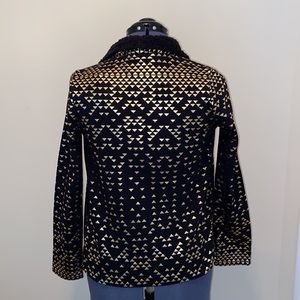 Are you shopping for that perfect statement piece for your outfit? Look no further! This jacket takes the style meter to its highest marking. Metallic gold triangles with a Sherpa- like fabric lining the chest and neck areas. NWOT. Worn only to try on. Has some stretch.