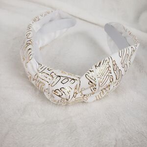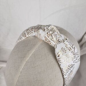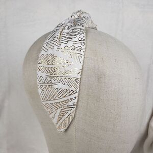 White with shiny gold metallic troplical leaf pattern. Wide band headband with top knot. NWOT, never worn