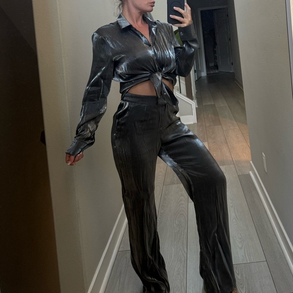 Stylish metallic two-piece set. Features a shiny top and matching pants. Perfect for a night out.