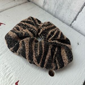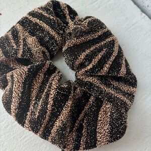 Metallic zebra print hair scrunchie with glitter accents. Made from a polyester spandex blend fabric.