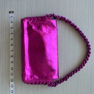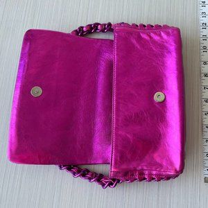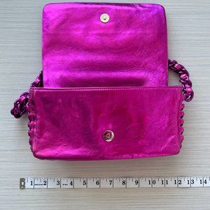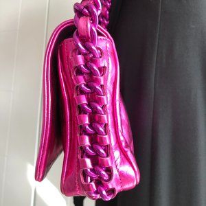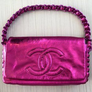 Metallic fuchsia pink shoulder/hand bag by Chanel. The stitched Logo is prominently displayed at front 4.5" x 3.5", tonal metallic metal hardware with chain around trim/handle. Front magnetic snap close. Interior is woven grey fabric with serial number tag at bottom corner, also comes with matching serial # cards. Interior 6" long zip pocket at back wall. This beauty measures 11" wide or across, 6" tall (without handle), 2.75" deep or thick, the chain handle measures 19" across x almost 1' thick. Logo patch at interior along with silver tone zipper pull with logo, very clean interior, highly collectible, hard to find this unique color, comes with dust bag, excellent condition!