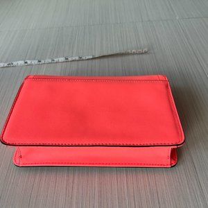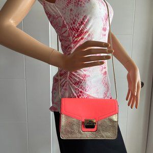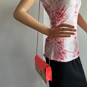 Milly neon coral with gold metallic cross body bag or clutch (long 48" snake chain can be removed or put in bag) NWT retail $198, black interior, interior zipper pocket. Bag itself measures 8" wide x 5.5" tall, comes in a different dust bag (not Milly), polished gold tone hardware, exterior close. Cool color combination!