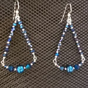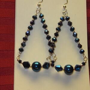 Earrings featuring blue bicone faceted beads with silver spacer seed beads. Color is a metallic blue with some iridescence. Weight: 0.1 oz/3 grams each. 3 inches from top of ear wire. Ear wires are silver plated and nickel-free. Brand new, never worn NWOT. Handmade by me, the SparklieFiend!