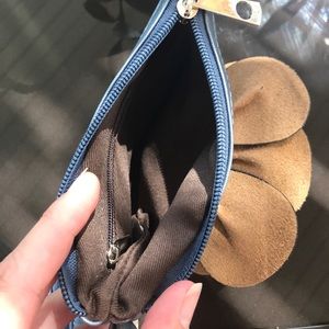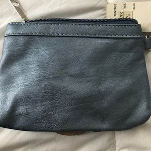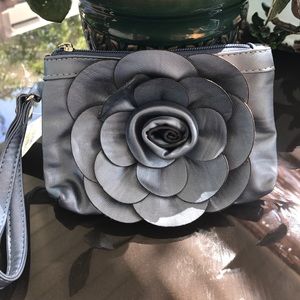 This is a metallic blue wristlet with a flower on the front. It is new with tags, never used. Dims are 6" length 5" high
