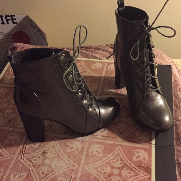 3 inch heel; lace up pewter/metallic booties