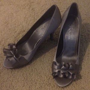 These heels are a grayish metallic color. Very simple but super cute. I wore them once at a wedding and haven't worn them since. They are sooo easy to walk in. They work well as both dressy and casual heels.