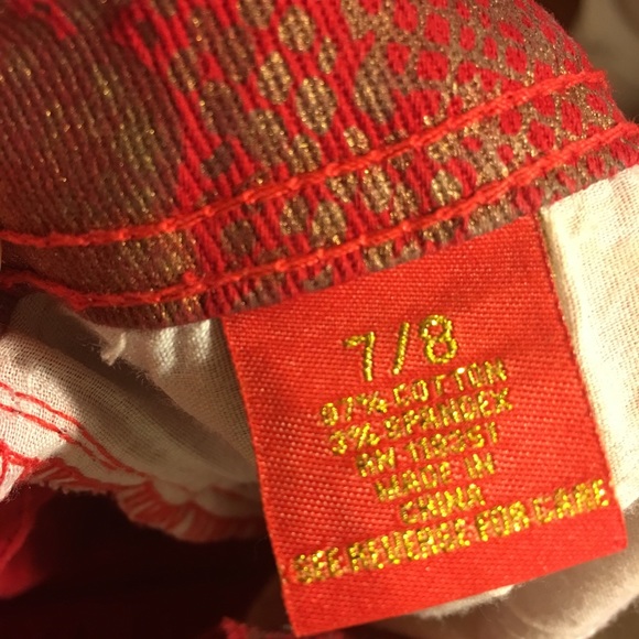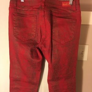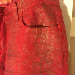 Red denim with metallic gold print. Straight leg jean. 5 pockets. Size 7/8.