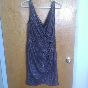 Bombshell! Gunmetal/pewter/dark silver metallic crinkle fabric -- picks up the light in evening occasions and you just shine!! -- faux wrap dress with attached brooch. Dress is fully lined in matte black poly. Deep V surplice neckline front and back. Left side zip. First picture has most true color. Waist 28"; skirt length 20" from waist seam; hips and bust variable and forgiving due to wrap style and very stretchy fabric. Freshly dry-cleaned. AMAZING on hourglass curves!!