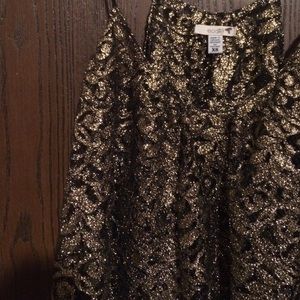 Black mesh with metallic gold glitter lace pattern. Spaghetti straps. Triangle/pointed hem.