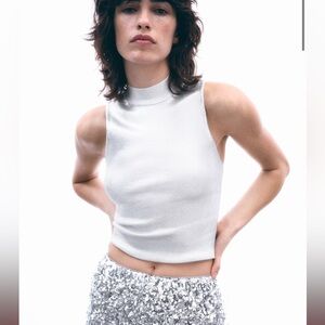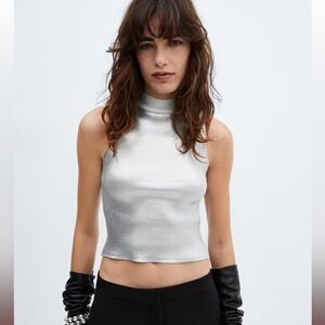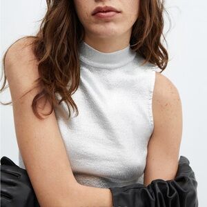Fine knit fabric. Short design. Metallic finish. Round neck. Sleeveless. No closure. Party and ceremony collection. Fitted design.