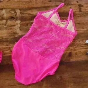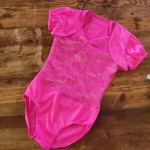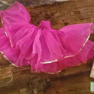 Pink and gold metallic lace bodice leotard. satin shrug. 3 layer tiered pettiskirt with sequin trimmed hem.